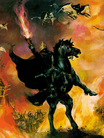 The Witch-king of Angmar is the most powerful of the Nazgûl. He was the the one who stabbed Frodo (LotR) with a Morgul-knife which almost killed the hobbit. After that failure he and the other ringwraiths were forced to return to Mordor. There the witch-king took control of Sauron´s army and launched an attack against Gondor. At Pelennor he slew the Lord of Rohan Théoden with his mace. For that he was challenged by Théoden´s niece Eowyn which he mistook for a man. He proclaimed that no man was fated to kill him and prepared to attack when Eowyn told him that she was a woman. Eowyn and the hobbit Meriadoc managed to destroy both him and his winged beast. Called dwimmerlaik by Eowyn, which means work of necromancy, spectre.